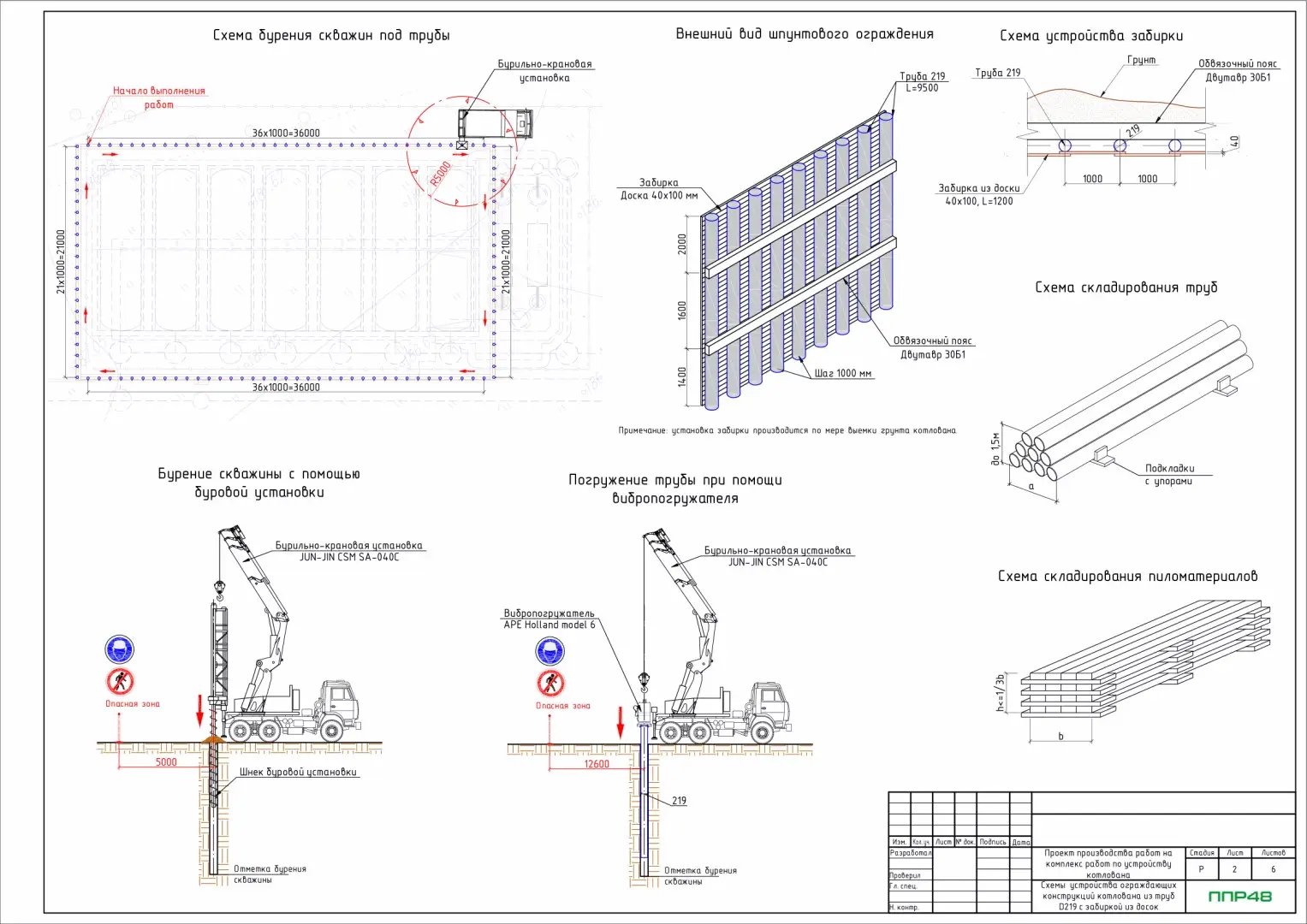 В стесненных условиях или при большой глубине заложения фундамента возникает необходимость в ограждении котлована. В большинстве случаев для этого используются шпунты Ларсена или трубы. Шпунт Ларсена погружают с помощью специального навесного оборудования, устанавливаемого на стрелу крана или экскаватора. Для устройства шпунта из стальных труб или железобетонных буронабивных свай используют специальные буровые установки. Этап закрепления откосов выемки - важный раздел в составе документа, требующий детальной проработки.
